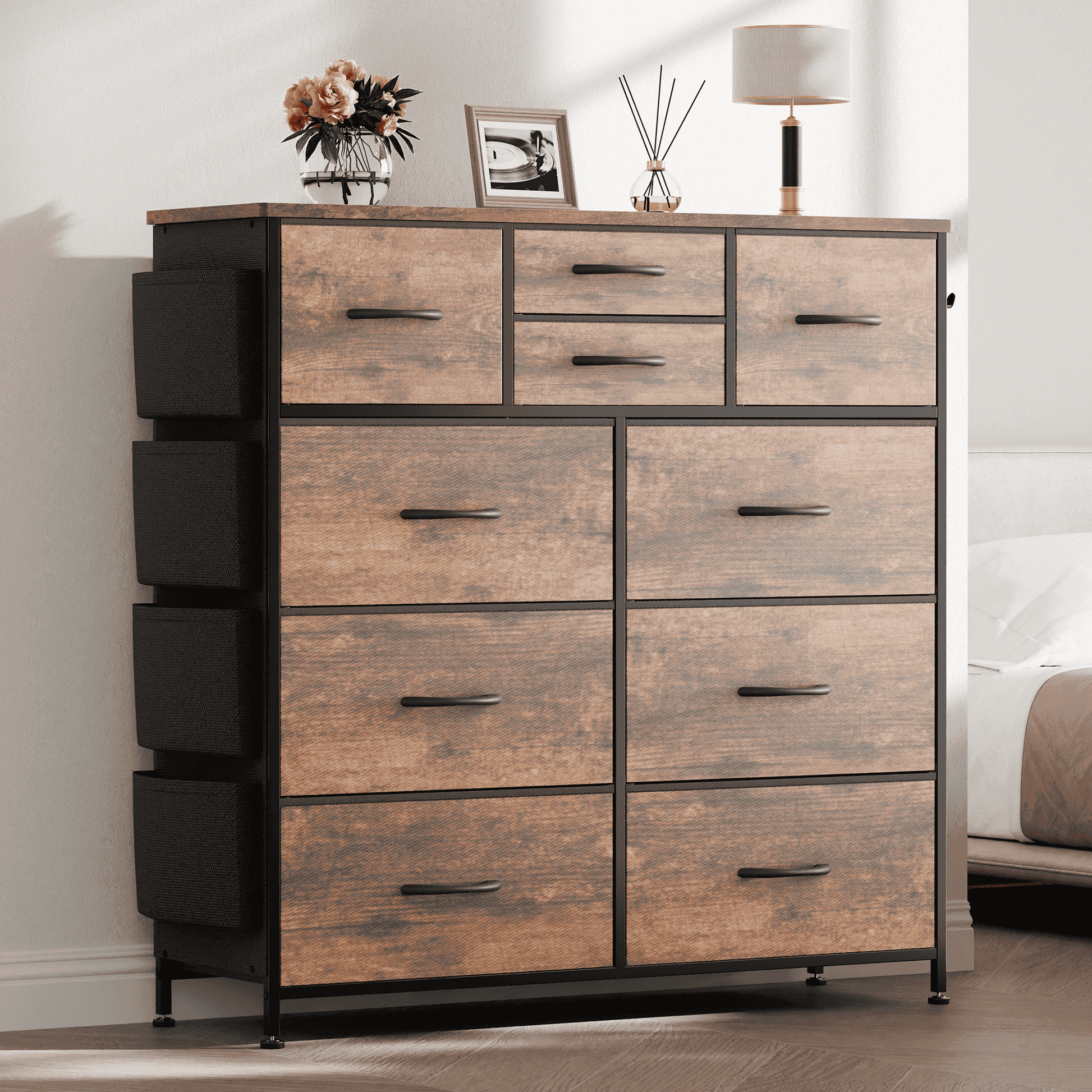 Aowos 10 Drawer Dresser, Chest of Drawers Dressers for Bedroom with 4 Side Pockets and 2 Hooks, Rustic Brown