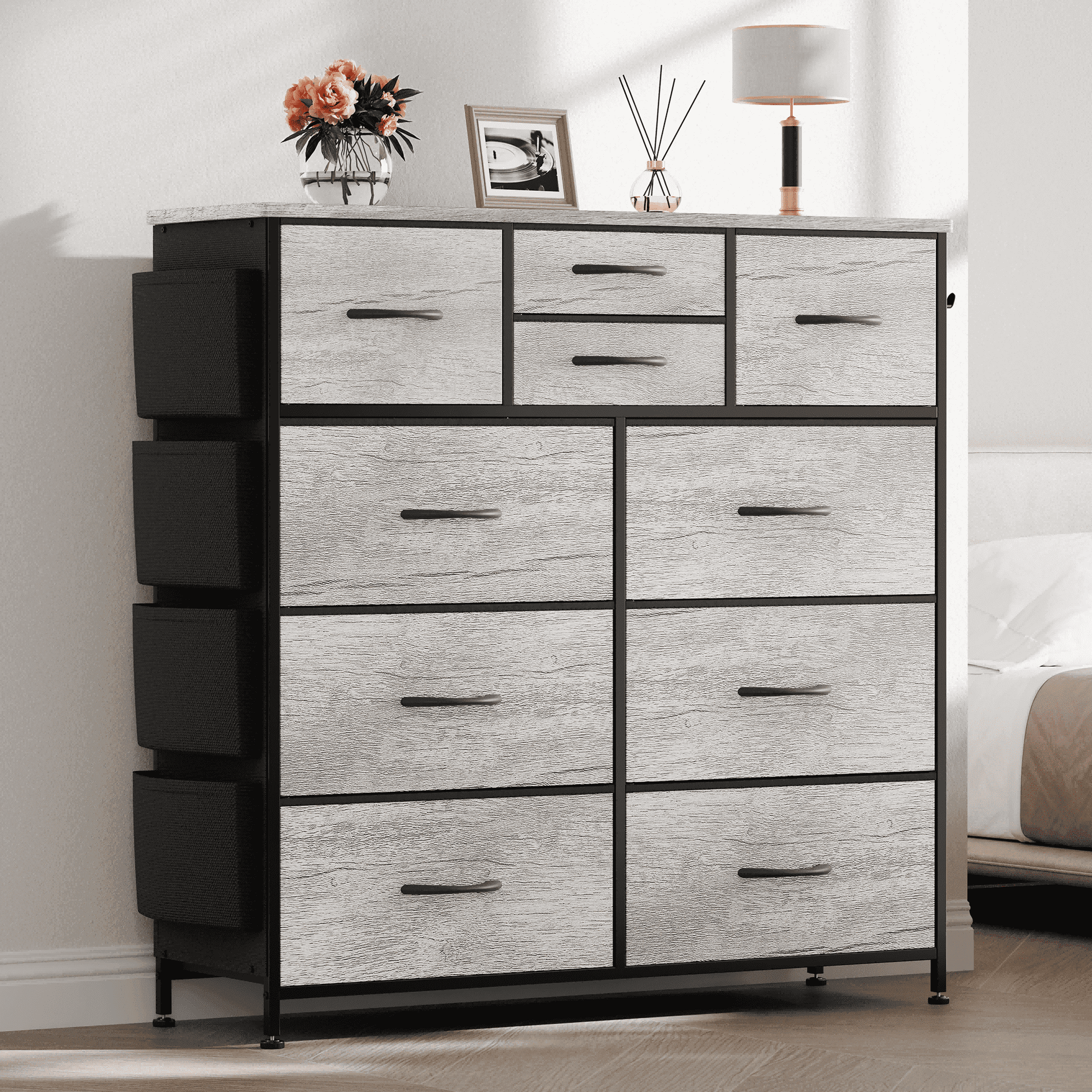 Aowos 10 Drawer Fabric Dresser for Bedroom, Chest of Drawers Organizer Storage Cabinet for Closet, Dressers with Side Pockets and Hooks for Entryway, Oak
