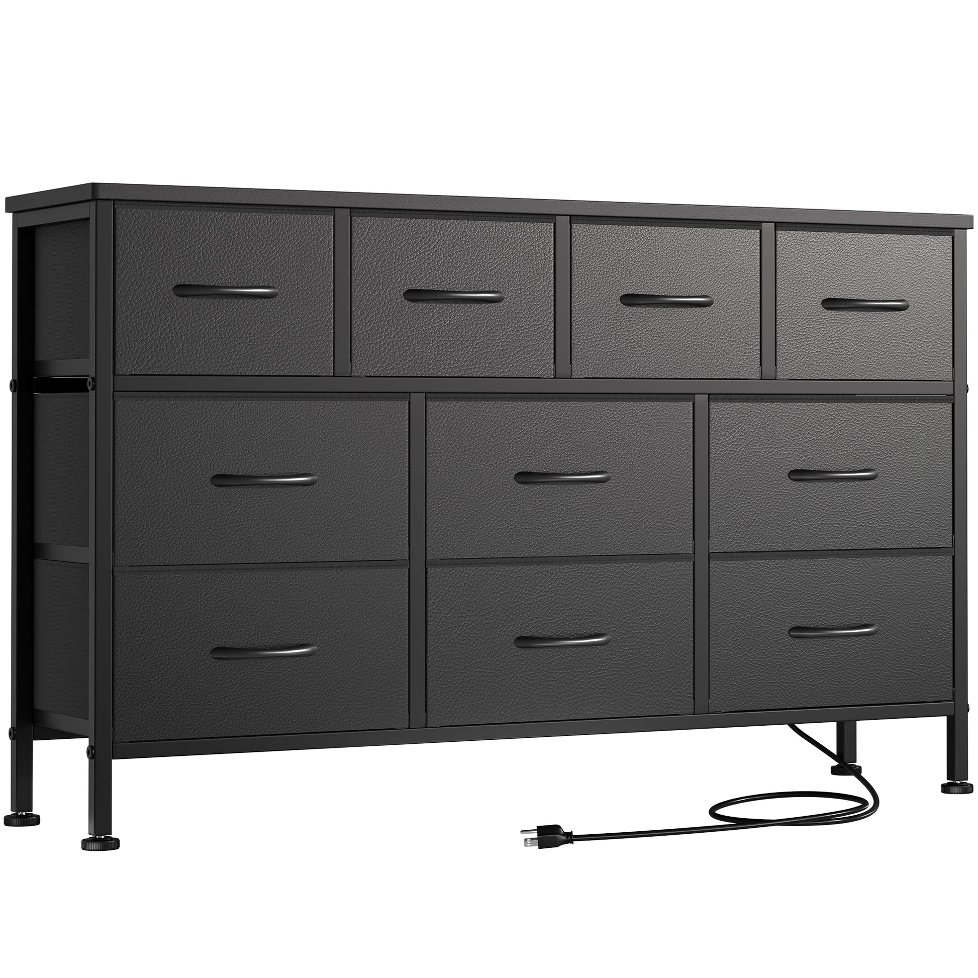 A spacious 10-drawer black dressers for bedroom storage dresser gives you plenty of room to organize things within reach while functioning as a TV stand or entertainment unit! Long dresser with thick wood top board can easily hold 110 lbs, perfect for TVs under 55 inches; 10 drawers dresser can store all your out-of-season clothes, shoes, handbags, and more with ease; Updated structure metal frame reinforcing bar provides extra strong support for longer; Significant design of anti-tapping device and adjustable floor-protected feet install tools are all included in the package for your quick and easy 30 min assembly!