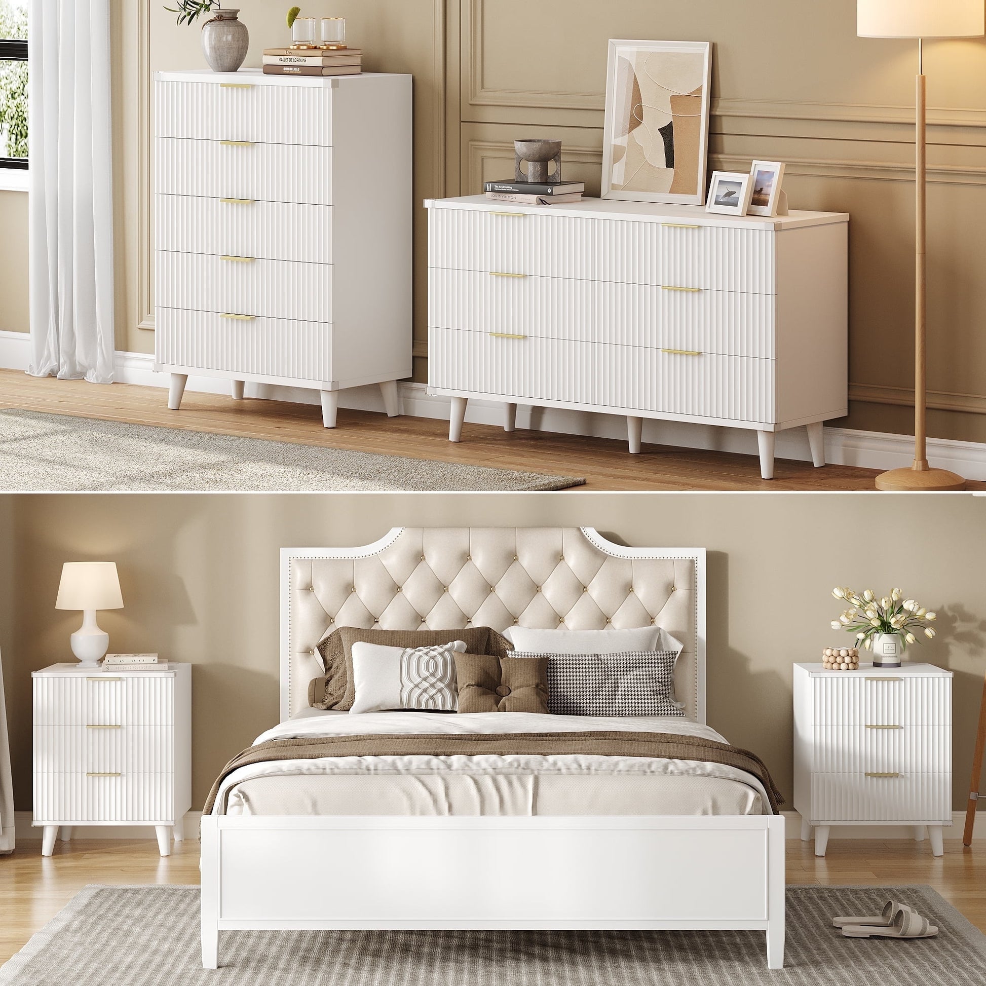 GIKPAL Bedroom Furniture Set - Includes 6 Drawer Dresser & 5 Drawer Dresser & 3 Drawer Nightstand Set of 2 with USB, Boho Dresser and Nightstand Sets, White