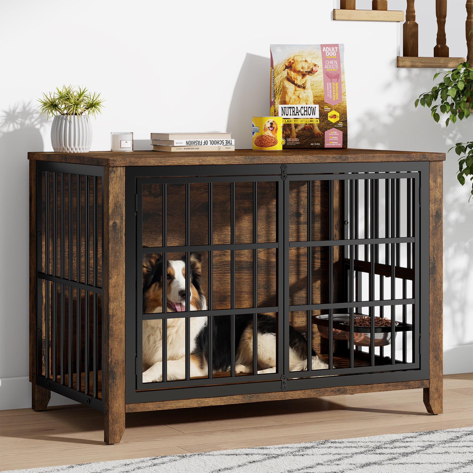 GIKPAL Dog Crate Furniture with Dual Rotating Bowls, Wooden Indoor Dog Kennel for Large Dogs, Sturdy Pet Crate Cage End Table, Brown
