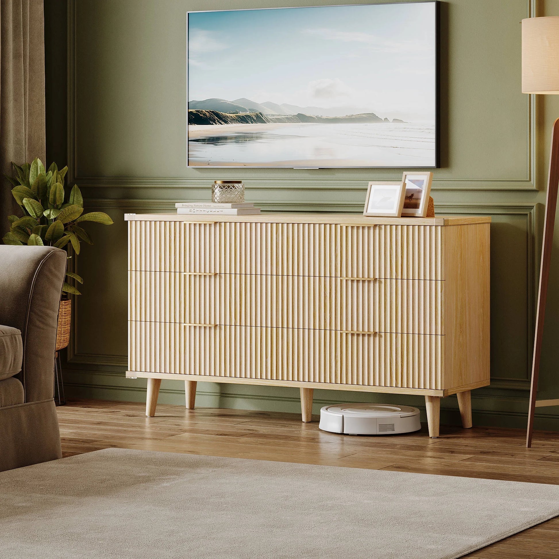 GIKPAL Dressers for Bedroom 6 Drawer, Wood Chest of Double Drawers Dressers, Modern Boho Fluted Storage Cabinet with Metal Handles, for Living Room, Entryway & Hallway, Natural