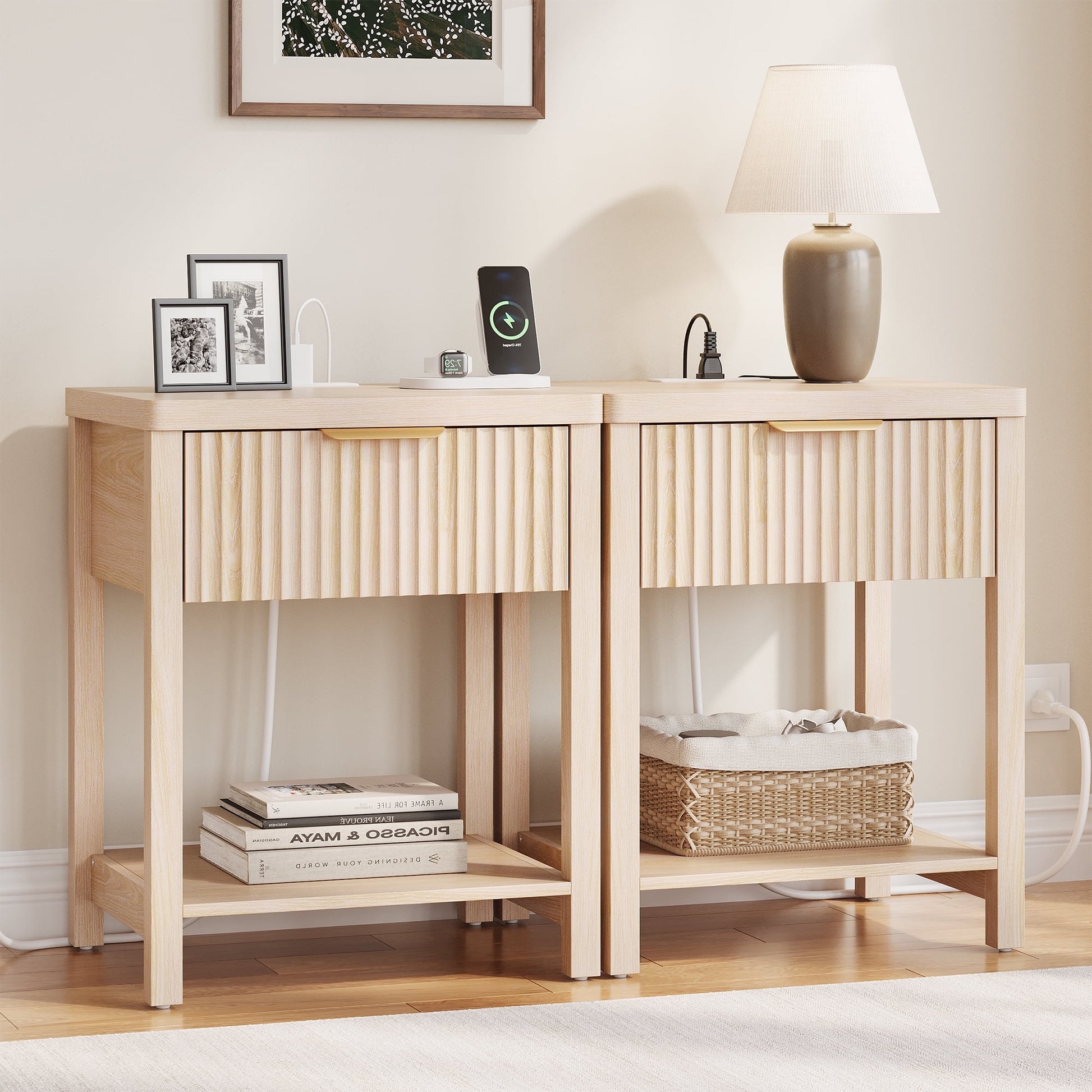 GIKPAL Fluted Nightstands Set of 2, Bedside Tables with Charging Station, Boho Side Tables with Drawer & Open Compartment for Bedroom, Walnut