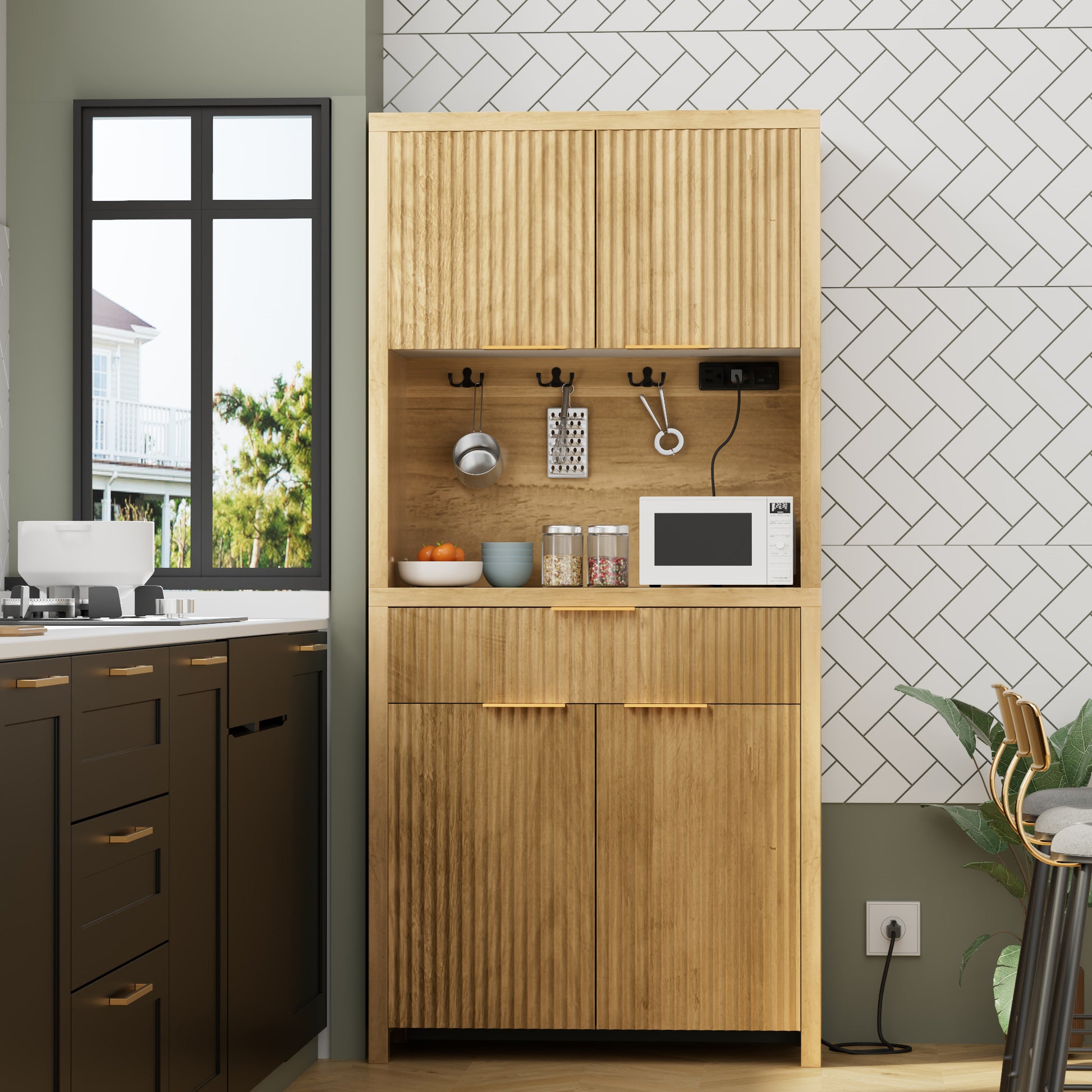 GIKPAL Pantry Cabinet with Charging Station, Fluted Kitchen Pantry Storage Cabinet with Shelves and Drawer, Boho Kitchen Hutch with Microwave Stand for Dining Living Room, Natural Oak