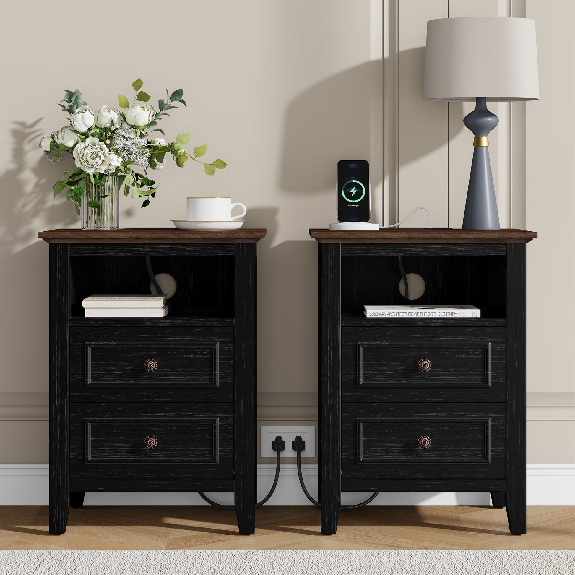GIKPAL Rustic Nightstand with Charging Station Set of 2, 2-Drawer Wooden Side Table for Bedroom & Living Room, Oak Black