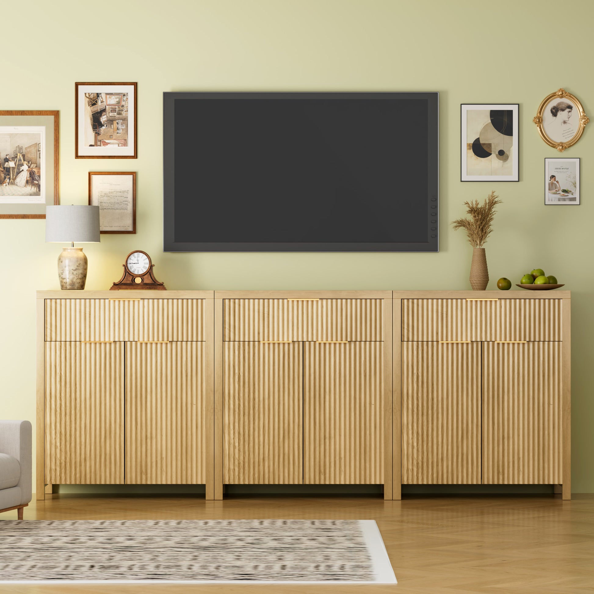 The solid wood construction of the GIKPAL storage sideboard cabinet ensures durability. Sideboards can not only be used as kitchen storage cabinets, entryway and coffee bar cabinets in the dining room, but are also suitable as tv stand credenza in the living room. The Fluted finish and sheet metal handles are designed to perfectly complement a variety of decorative styles, from contemporary to traditional. Bring variety to your space with this unique storage cabinet. Soft-close silent hinges and drawer guides in the tv sideboard buffet cabinet accent reduce noise. The storage tv stand has a spacious interior with drawers and adjustable shelves for flexible storage.